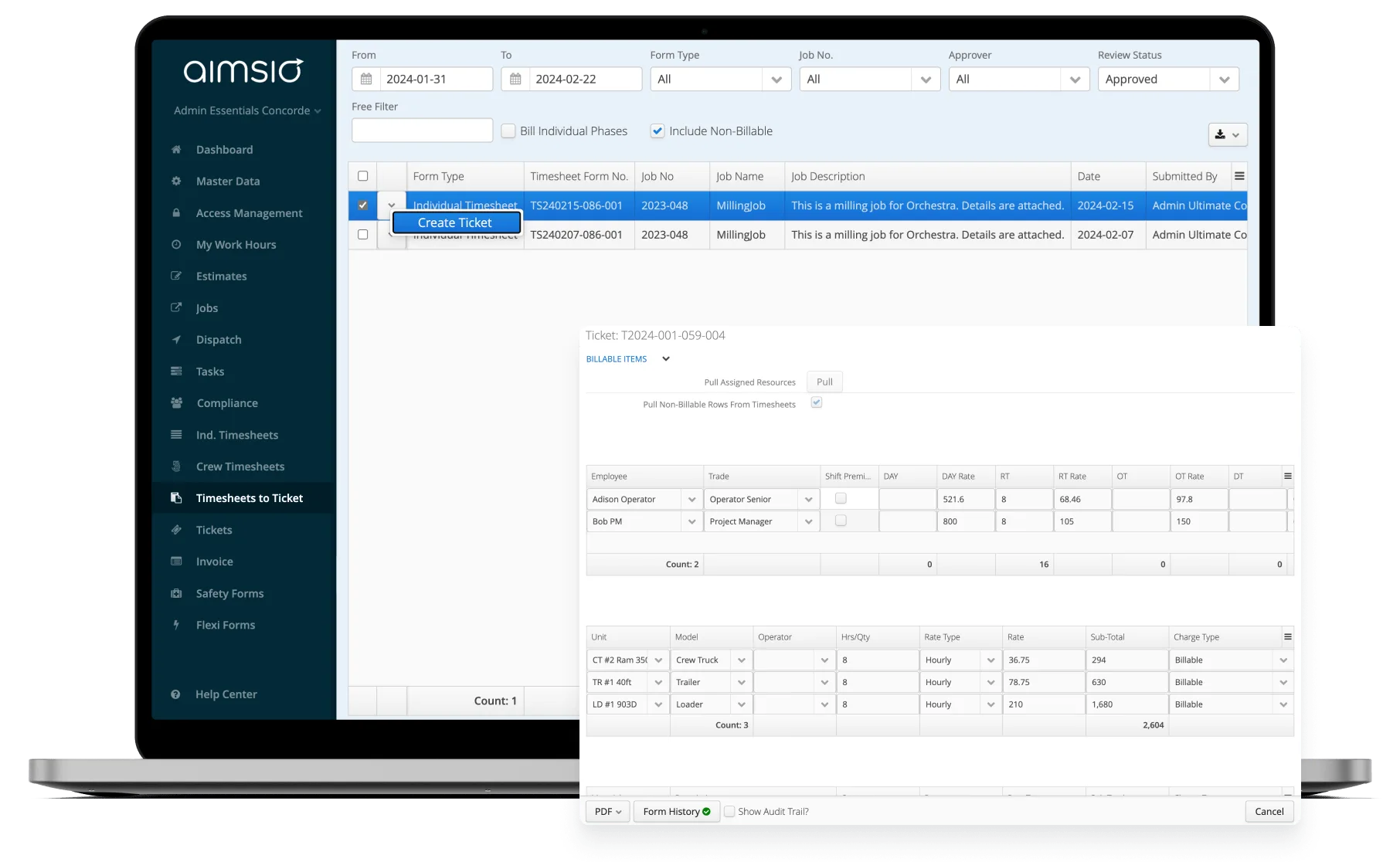 Once approved, Timesheets can be converted into billable Tickets without the need for double data entry.